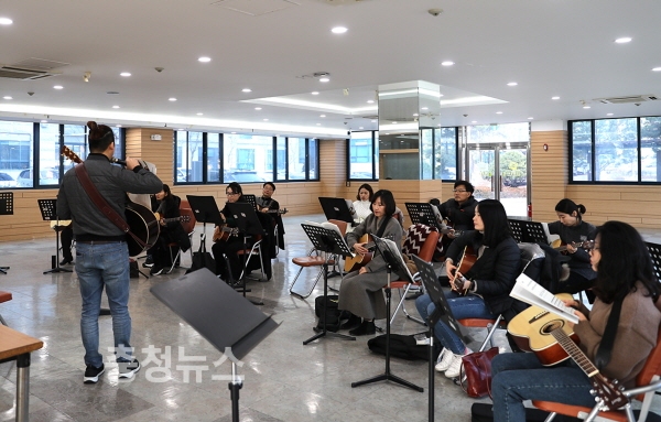 국립 한밭대 동계 교원 직무연수에서 ‘혼자서 치는 통기타’ 과정을 수강하는 교원들이 강사의 설명을 듣고 있다.