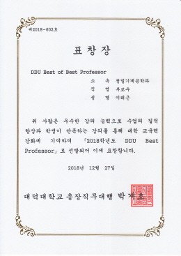 대덕대학교 정밀기계공학과 이태근 교수가 2018학년도 DDU Best of Best Professor로 선발되어 표창을 받았다.