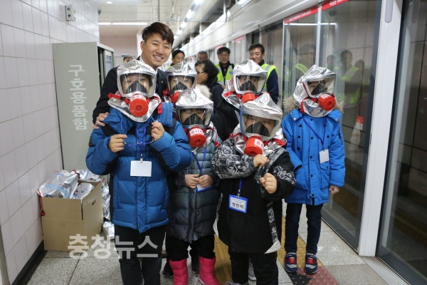 10일 도시철도공사 안전체험열차 행사에 참여한 학생들이 우승호시의원과 화재마스크 착용 체험을 하고 있다.