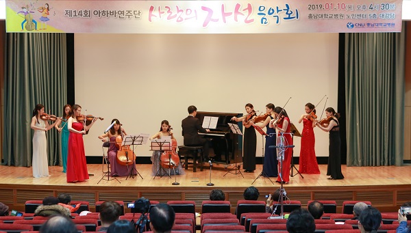 충남대병원(원장 송민호)은 10일 오후 노인센터 5층 강당에서 젊은 연주자들의 재능기부를 통해 대전지역의 어려운 환자들을 돕는 ‘제14회 아하바연주단 사랑의 자선 음악회’를 열었다.