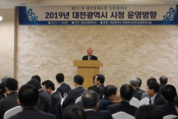 대전상공회의소(회장 정성욱)가 주최한 ‘제211차 대전경제포럼 조찬세미나’가 10일 오전 7시 유성호텔 킹홀에서 개최된 가운데, 허태정 대전시장이 올해 첫 연사로 나서 대전시정 운영방향을 주제로 강단에 섰다.