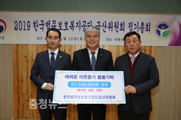 지난 10일 「한국법무보호복지공단 금산위원회」 정기총회에서 주변의 소외된 이웃을 위해 써 달라며 가래떡 10말, 돼지고기 목살 100kg, 계란 120판 등 시가 250만원 상당의 물품을 기탁하였다.