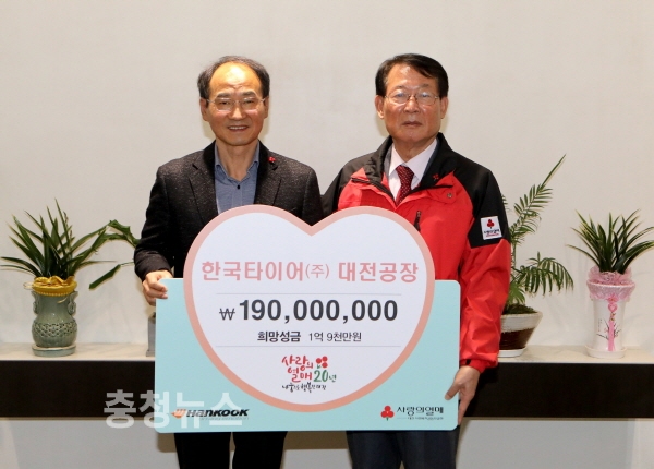 한국타이어(대표이사 조현범)는 지난 11일 대전 대덕구 소재 한국타이어 대전공장에서 안기호 대전사회복지공동모금회장, 윤정록 한국타이어 대전공장장 등이 참석한 가운데 ‘희망 2019 나눔 캠페인’에 이웃사랑 성금 1억 9천만 원을 전달했다.