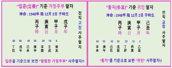 동지(冬至)로 사주팔자의 연주(年柱:새해)를 정하면 대운이 좋아 교장을 역임할 수 있는 좋은 운세가 되지만, 입춘(立春)으로 사주팔자의 연주(年柱:새해)를 정하면 대운이 나빠서 교장은커녕 평범한 가정주부로 살기도 어려운 나쁜 운세가 된다.