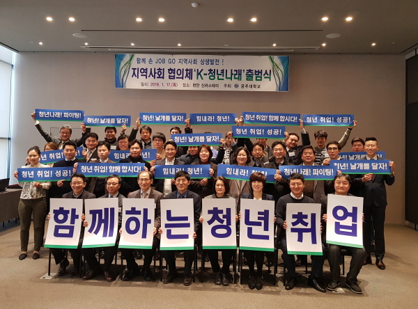 공주대학교(총장직무대리 박달원)는 17일 천안 신라스테이 호텔에서 함께 손 JOB GO 지역사회와 상생발전을 위한 지역사회 협의체인‘K-청년 나래’출범식 행사를 개최했다.