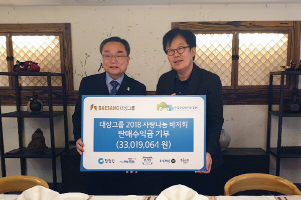 윤영균(좌측) 한국산림복지진흥원장이 18일 서울 동대문구 신설동 대상(주) 본사에서 대상그룹 권용석 상무로부터 ‘대상그룹 2018 사랑나눔바자회’의 판매수익금을 전달 받은 뒤 기념촬영을 하고 있다.
