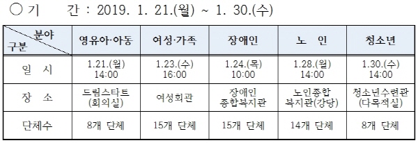 21일 영유아·아동, 23일 여성·가족, 24일 장애인, 28일 노인, 30일 청소년