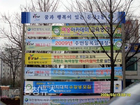 동별 의견 수렴해 동정구호 표시, 걸이대 설치 등 대전 서구(청장 가기산)가 아름다운 서구 만들기 일환으로 각 동에 설치돼 있는 행정용 현수막 게시대를 일제 정비한다. ▲ 게시대-정비전 구는 18일 최근 행정홍보의 수요가 증가함에 따라, 지난 옥외광고물 평가에서 최우수 기관으로 선정돼 수상한 상금 6천만원을 이번 정비에 투입하기로 했다고 밝혔다. ▲ 게시대-정비전. 구는 이를 위해 게시대 상판에 각 동의 의견을 수렴해 선정된 동정구호를 표시하고, 현수막을 걸때 끈 또는 철사가 필요 없는 걸이대를 설치할 예정이다. 이와 함께 현수막 철거 후에도 지저분한 잔재물이 남지 않도록 할 방침이다. 구 관계자는 “그동안 제각각이었던 현수막 게시대를 통일해 정비함으로써 개성은 높이되 홍보효과는 극대화할 예정”이라고 말했다. 저작권자 © 충청뉴스 무단전재 및 재배포 금지 성재은 기자 다른기사 보기 기사가 마음에 드셨나요? 충청뉴스 좋은 기사 후원하기 1,000원 3,000원 5,000원 10,000원 30,000원 50,000원 직접입력 비회원 약관동의하기 ※ 소중한 후원금은 더 좋은 기사를 만드는데 쓰겠습니다.