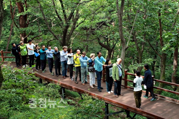 경북 영주시 봉현면 소재 국립산림치유원 마실치유숲길 데크로드에서 이용객들이 숲길산책프로그램을 체험하고 있다.