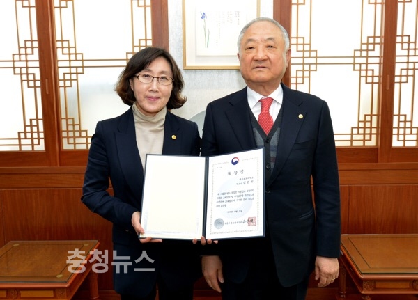 장택현 대학혁신위원장이 유아교육과 심은희 교수에게 표창장을 전달하고 있다.(왼쪽부터 심은희 교수, 장택현 대학혁신위원장)