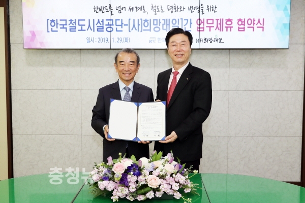철도공단 김상균 이사장(오른쪽)과 희망래일 이철 이사장(왼쪽)이 업무제휴 협약을 맺었다.