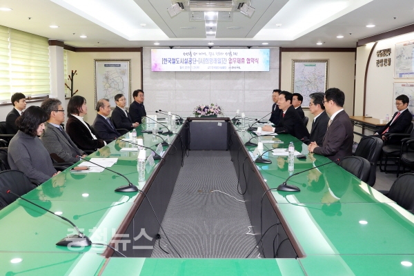 철도공단 김상균 이사장(오른쪽 테이블 앞에서 3번째)과 희망래일 이철 이사장(왼쪽 테이블 앞에서 4번째)이 관계자들과 업무제휴 협약을 위한 회의를 하고 있다.