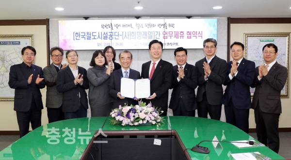 철도공단 김상균 이사장(오른쪽 5번째)과 희망래일 이철 이사장(오른쪽 6번째)이 업무제휴 협약을 맺고 관계자들과 함께 기념촬영을 했다.