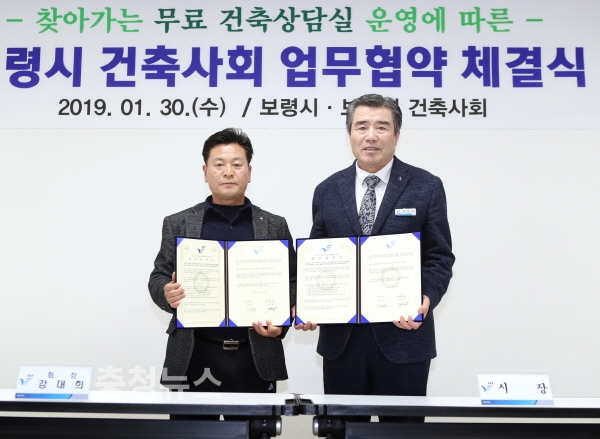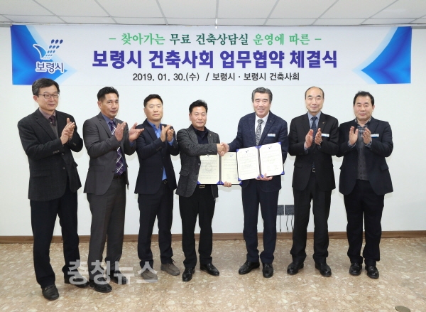 충남 보령시는 30일 오후 시청 상황실에서 김동일 시장과 강대희 보령시건축사회장 등 관계자가 참석한 가운데 무료 건축상담실 운영을 위한 업무협약을 체결했다.