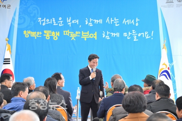 박정현 부여군수가 신년 읍면 순방 '찾아가는 동행콘서트'에서 군민들과 대화하고 있다.