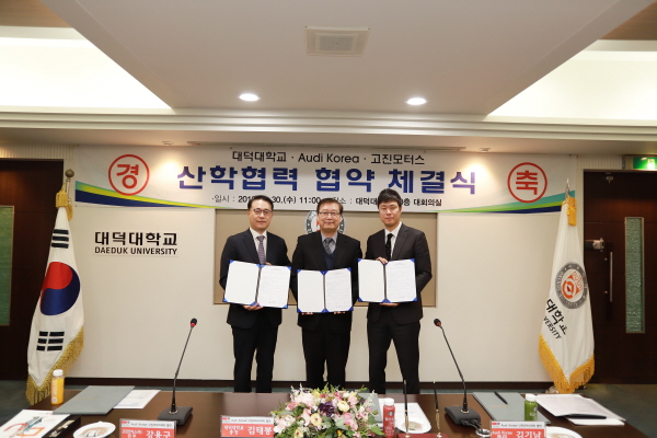 대덕대학교(총장 김태봉) 자동차학과는 30일 대덕대학교 정곡관 10층 대회의실에서 아우디코리아(Audi Volkswagen Korea Ltd), 고진모터스(주)와의 3자 간 산학협력 협약 체결 및 실습차량 기증식을 가졌다.