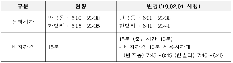 분 배차간격을 적용하는 시간대는 반곡동 출발 7:45~8:45, 한별리 출발 7:40~8:40으로 한 시간 동안 운행하게 된다.