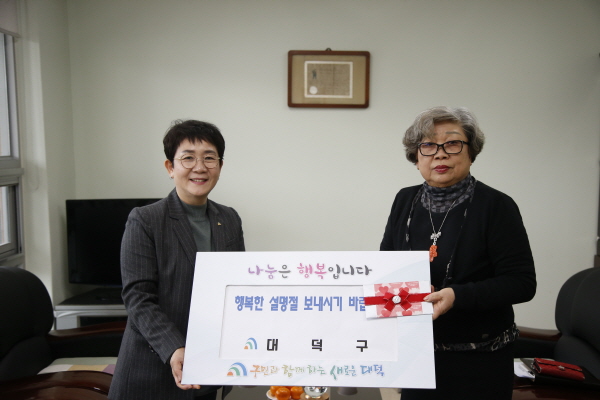 박정현 대덕구청장은 “예부터 명절은 함께 어울리는 날로 어느 때 보다 나눔과 사랑이 필요할 때라며 이웃을 향한 따뜻한 관심을 기울여 줄 것”을 주민에게 당부하며 “사회적 약자가 보호받는 사람 중심의 복지공동체 대덕을 만드는데 최선을 다하겠다” 고 말했다.