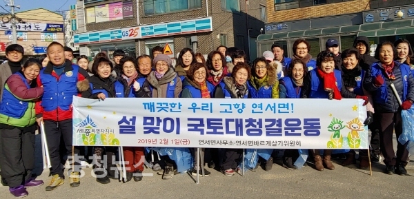 세종특별자치시 연서면(면장 홍순제)과 새롬동(동장 김학준)이 설 명절 고향을 찾은 귀성객과 주민들에게 청결하고 따뜻한 이미지를 제공하고자 1일 설맞이 국토대청결 환경정화 봉사활동을 전개했다.