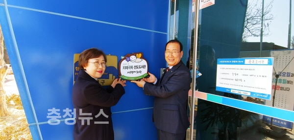 지난달 29일 대덕구치매안심센터와 송촌도서관이 치매예방과 인식개선을 위한 업무 협약을 마치고, 송촌도서관에서 치매극복 선도도서관 현판식 모습