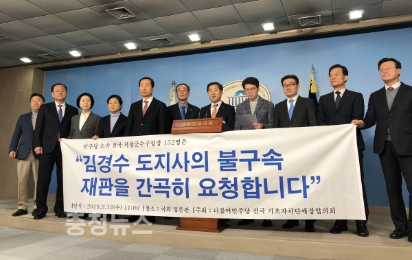 황명선 논산시장(더불어민주당 전국기초자치단체협의회장)이 민주당 소속 기초단체장 152명을 대표해 김경수 도지사의 불구속 재판을 촉구했다.
