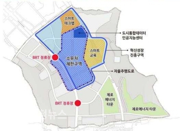 특히 최적화된 모빌리티 서비스를 제공할 수 있도록 도시 공간구조부터 새롭게 계획하여, 자율주행·공유 기반의 첨단교통수단 전용도로와 개인소유차량 진입제한 구역 등이 실현될 예정이다. 예컨대, 자율차 전용도로 구역(링 형태) 안에서는 개인소유차의 통행·주차를 제한하고 자율 셔틀과 공유차 이용을 유도할 계획이다.