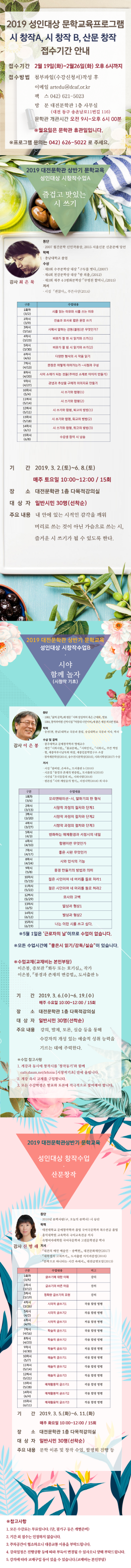다음달 2일부터 시작되는 이번 문학교육프로그램은 3개반으로 운영된다. 매주 토요일 오전 10시에는 시창작반A(강사 최은묵), 매주 수요일 오전 10시에는 시창작반B(강사 이은봉), 매주 화요일 오전 10시에는 산문창작반(강사 신명래)이 각 15주 동안 무료로 진행된다. 접수기간은 2월 19일(화)부터 2월 26일(화) 오후 6시까지로, 반별 30명을 선착순 모집한다.