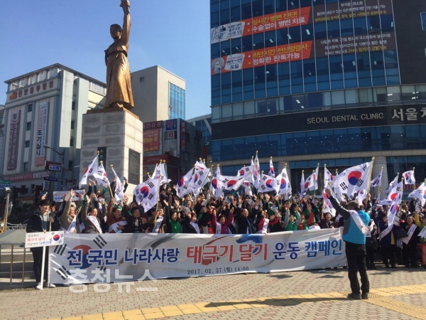 천안시는 신부동 아라리오 광장에서 시민 자원봉사자, 바르게살기운동천안시협의회, 한국자유총연맹천안시지회, (사)나라사랑태극기달기국민운동본부, 농협중앙회 천안시지부 등 시민 200여 명이 참석한 가운데 태극기 달기 캠페인을 추진한다고 20일 밝혔다.