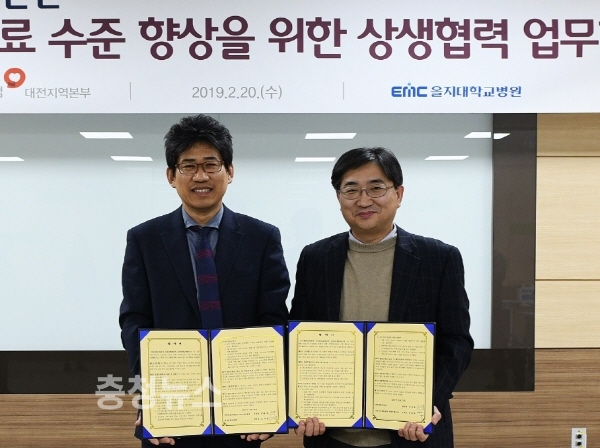 국민건강보험공단 대전지역본부(본부장 안희무)는 20일(수) 7층 회의실에서 을지대학교병원(원장 김하용)과 보장성강화정책 지원과 지역 보건의료 수준 향상을 위한 업무협약을 체결했다.