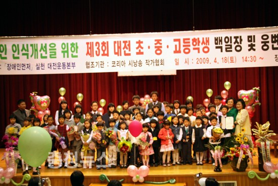 제29회 장애인의 날을 맞아 「장애인먼저」실천 대전운동본부(정상범본부장)가 주관하고 코리아시낭송작가협회 이정윤회장이 협조한 제3회 대전유치부. 초‧중‧고 백일장 및 웅변(동화구연)대회가 4월 18일(토)대전시교육청 대강당에서 개최했다.