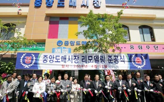 대전 동구(구청장 이장우)가 22일 이장우 동구청장과 김종성 동구의회 의장 등 100여명이 참석한 가운데 원동 중앙도매시장에서 건물 리모델링 준공식을 가졌다.