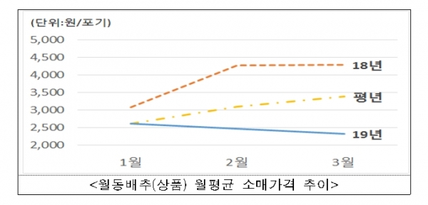 평년·전년의 3월에는 월동배추 가격이 상승세를 보였으나, 올해 3월 가격은 하락세가 이어지고 있는 상황이다. 다만, 정부의 시장격리 등 가격안정대책 시행으로 향후 보합세를 보일 것으로 전망된다.