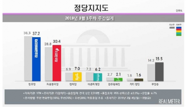 여론조사 기관인 리얼미터가 YTN 의뢰로 지난 4-8일 전국 성인 남녀 2518명을 상대로 조사(신뢰수준 95%에 표본오차 ±2.0%p)한 결과 한국당 지지율은 전주 보다 1.6%p 상승한 30.4%를 기록했다. 한국당 지지율이 30%대를 기록한 것은 최순실 사태가 불거지기 전인 2016년 10월 둘째 주(31.5%) 이후 2년 5개월 만이다.