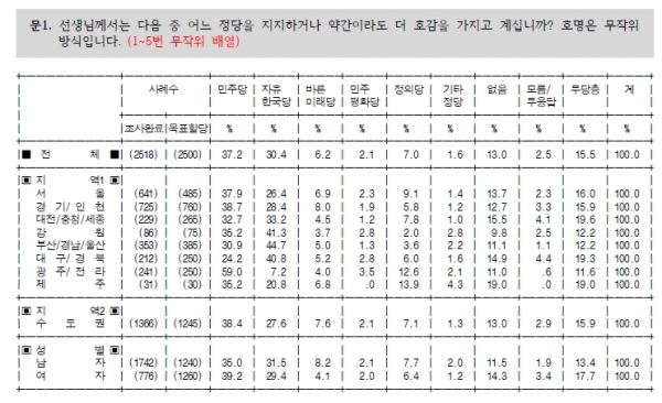 이번 조사에서 더불어민주당 지지율은 전주 대비 1.1%포인트 내린 37.2%로, 2주 연속 하락세를 보였다. 정의당은 7.0%, 바른미래당은 6.2%, 민주평화당 2.1%를 기록했다.