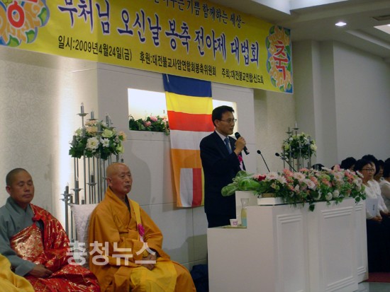 대전사암연합회 회장 도안스님이 부처님 오신날 봉축 전야제 대법회에 박성효 시장이 불참한 가운데 권선택, 염홍철 두 시장후보는 참석했다.