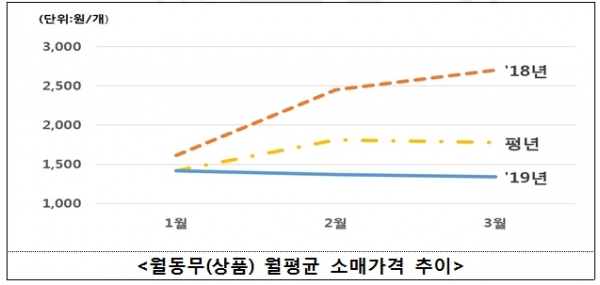 KREI 농업관측월보(’19년 3월)에 따르면, 월동무 시세가 낮게 형성된 원인은 월동무 생산 및 가을무 저장량이 많고, 소비가 부진하기 때문인 것으로 나타났다. ’18년 월동무 생산량은 재배면적이 3% 가량 증가하고(6,475ha) 겨울철 따뜻한 날씨로 생산단수가 늘면서 전년보다 약 20% 증가한 35만 2천톤으로 추정된다.