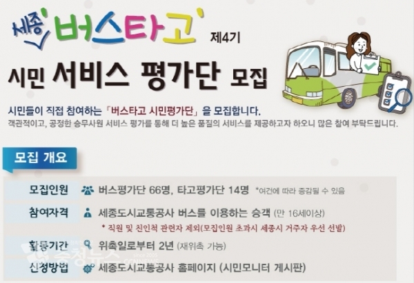 이번에 모집하는 서비스 평가단원은 80명이며, 지원자격은 만 16세 이상의 시민으로서 세종도시교통공사 버스를 이용하는 승객이면 누구나 가능하고 세종도시교통공사 홈페이지(시민모니터 게시판)를 통하여 4월 10일까지 신청하면 된다.