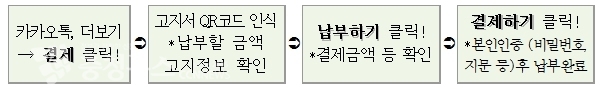 카카오페이 간편결제를 이용할 납부자는 스마트폰 카카오톡 앱에서 고지서 QR코드를 인식시켜 고지내역을 확인하고, 본인인증 후 보험료를 납부할 수 있다.