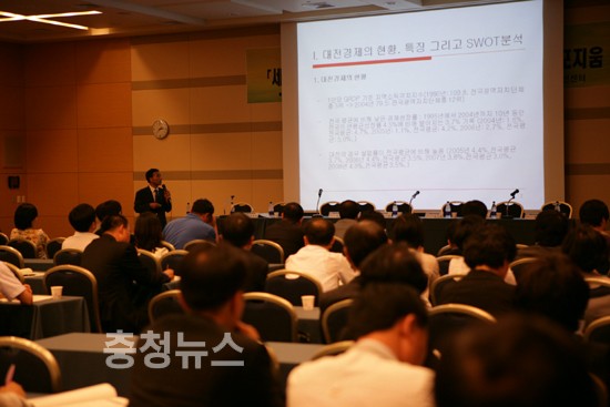제 1주제 발표 : 세종시 건설을 활용한 대전경제 발전방향 이날 심포지움에서 고려대학교 세종캠퍼스 박종찬 교수(경영학부)는 「세종시 건설을 활용한 대전경제 발전방향」이란 주제발표에서 『세종시 건설로 인해 대전시, 세종시, 충북의 오송, 오창, 그리고 충남의 천안, 아산을 연결하는 광역경제권의 구축으로 규모의 경제와 범위의 경제가 실현될 수 있고 네트워크 효과, 외부경제효과 그리고 자극효과의 극대화로 대전은 대한민국의 행정경제과학 중심지로 부상할 새로운 발전의 기회를 가질 수 있다』고 진단했다,