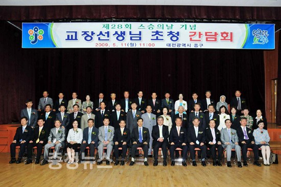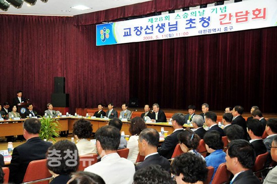 대전 중구(구청장 이은권)가 제28회 스승의 날을 맞아 장수마을관리원에서 11일 김동규 동부교육장과 관내 56개교의 초·중·고 교장선생님과의 간담회를 갖고 참교육 실천방안을 모색했다. 이날 간담회에는 전국 최초로 구청 6급 담당공무원들로 구성된 1학교 1담당도우미 56명이 참가, 학교의 애로사항을 청취했다.