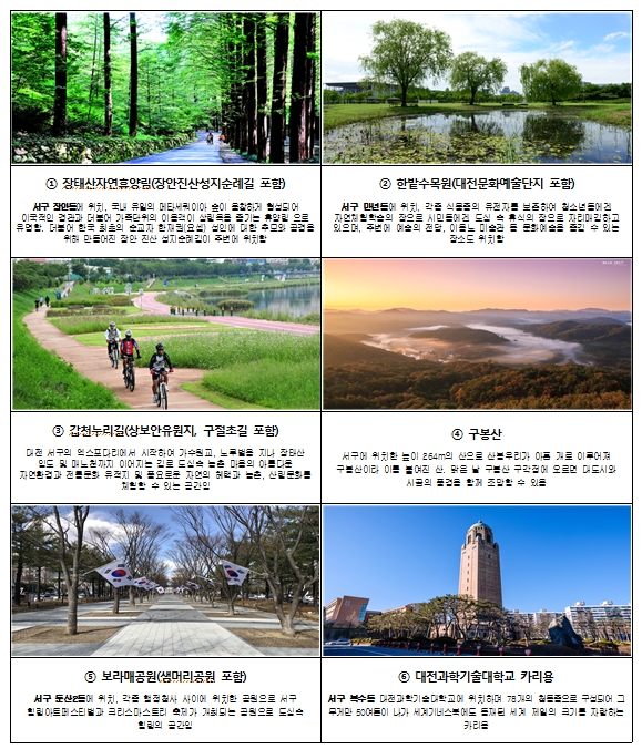 ‘대전 서구 함께 가고 싶은 열 곳’ 중 1위가 장태산자연휴양림(장안진산 성지순례길 포함), 2위가 한밭수목원(대전문화예술 단지 포함)이다.