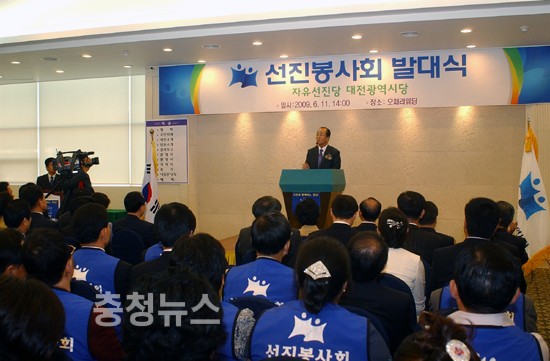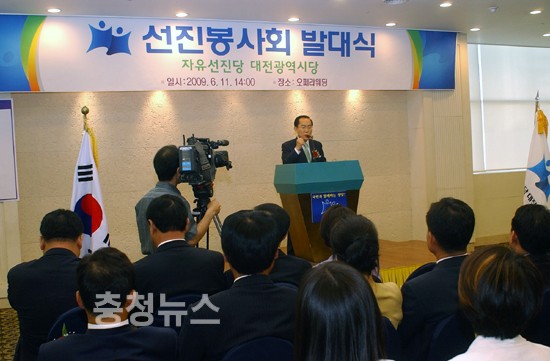 자유선진당 이회창 총재는 "선진봉사회 발대식은 대전에서 따뜻한 보수의 깃발을 들어준 것" 이라고 말했다.