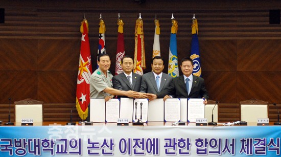 충남도와, 논산시 국방부는 17일(수) 오후 4시 30분 국방부 대 회의실에서 당초 원안대로 국방대를 전체 이전하기로 하는 합의문에 공식 서명했다.