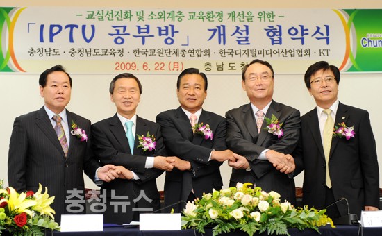 충남도가 전국 최초로 저소득 소외계층 아동·청소년들을 위한 'IPTV 공부방'을 운영한다. 도는 22일 오전 도청 소회의실에서 이완구 충남지사와 김종성 교육감, 이원희 한국교총 회장, 이상훈 KT 기업고객분야 사장 등이 참석한 가운데 시·군 지역아동센터를 활용한 'IPTV 공부방'을 위한 협약을 체결했다고 밝혔다.