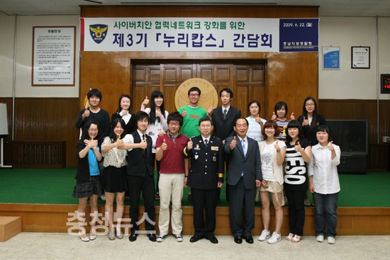 충남지방경찰청(청장 박종준)은 2009. 6. 22. 10:30 지방청 대회의실에서 박종준 청장과 제3기 충남청 누리캅스 26명이 참석한 가운데 사이버공간의 협력치안 네트워크 강화를 위한간담회를 가졌다.