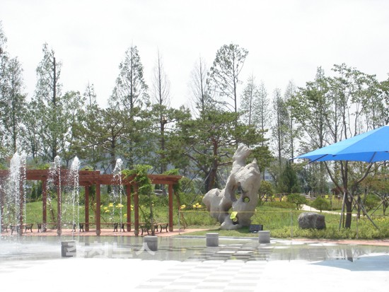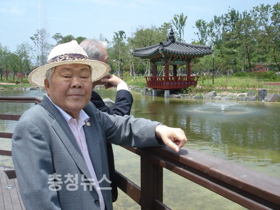 ▲ 이인구 명예회장이 한반도 모양의 반도지(연못)에서............