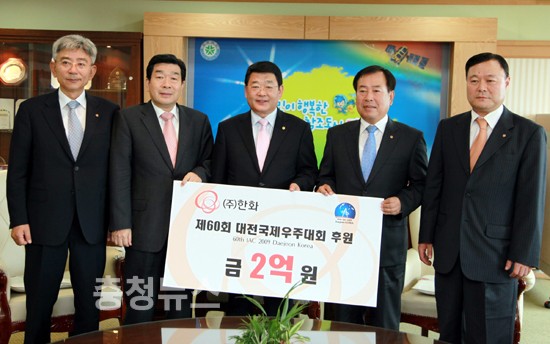 ㈜한화 남영선 대표이사가 20일 대전시를 방문, 박성효 시장에게 대전국제우주대회(2009 IAC)에 사용할 불꽃 연화 등 후원 물품 2억원 어치를 전달했다.