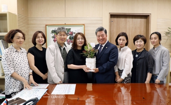 이날 세종시민사회단체연대회 관계자들은 의정모니터링 보고서를 의회에 제출하기 위해 산업건설위원회 차성호 위원장의 집무실을 찾았다. 차 위원장은 시민단체 관계자들로부터 축하 화분을 건네받은 후 2019행정사무감사 모니터링에 대한 총평과 소감을 청취했다.