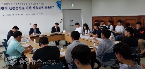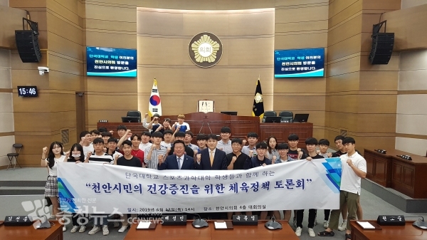 천안시의회 허욱 의원(윤리특별위원장)은 13일(목) 14시 천안시의회 다목적실에서 단국대학교 스포츠과학대학 학생들과 함께 ‘천안시민의 건강증진을 위한 체육정책 토론회’를 가졌다.