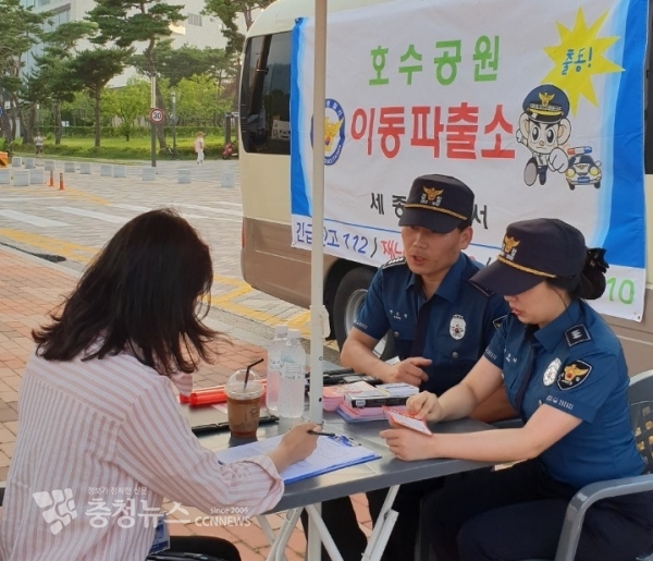 여름철을 맞아 야간시간 열대야를 피해 세종호수공원을 찾는 시민들이 늘어날 것으로 예상됨에 따라, 세종경찰은, 각종 사건사고에 신속하고 효율적으로 대응하고 다양한 민원 서비스를 제공하기 위한 이동파출소를 열고 시민들을 맞이한다. 운영은 22일부터 이며, 매주 토요일과 일요일 오후 5시부터 10시까지, 호수공원 중앙광장 등 공원일원에서 다양한 치안활동을 펼친다.